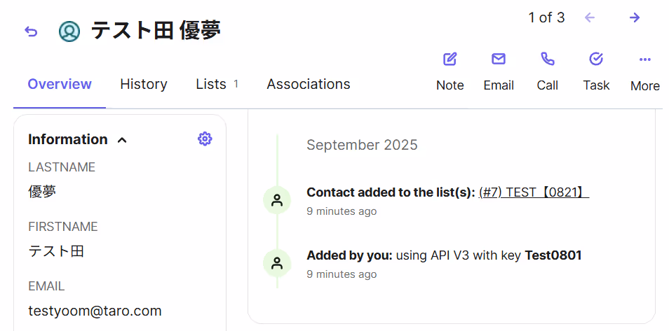 ここで実際に、Brevoアカウントにログインしてみましょう。設定した通りの内容で、コンタクトが作成されていますね。