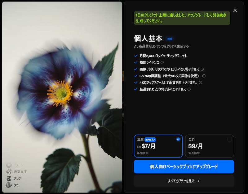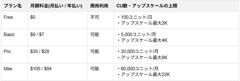Freeプラン :1日に100CU付与(画像生成3枚程度、動画生成は1本あたり約100CU以上を消費するため、無料枠内での生成は現実的ではありません)