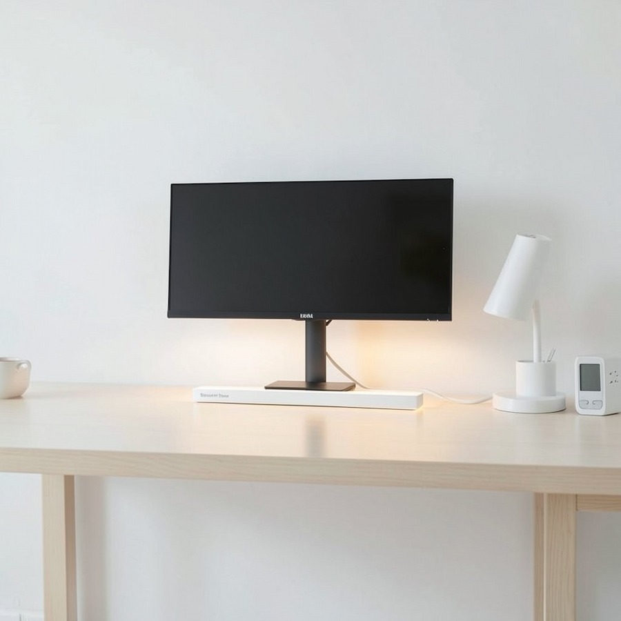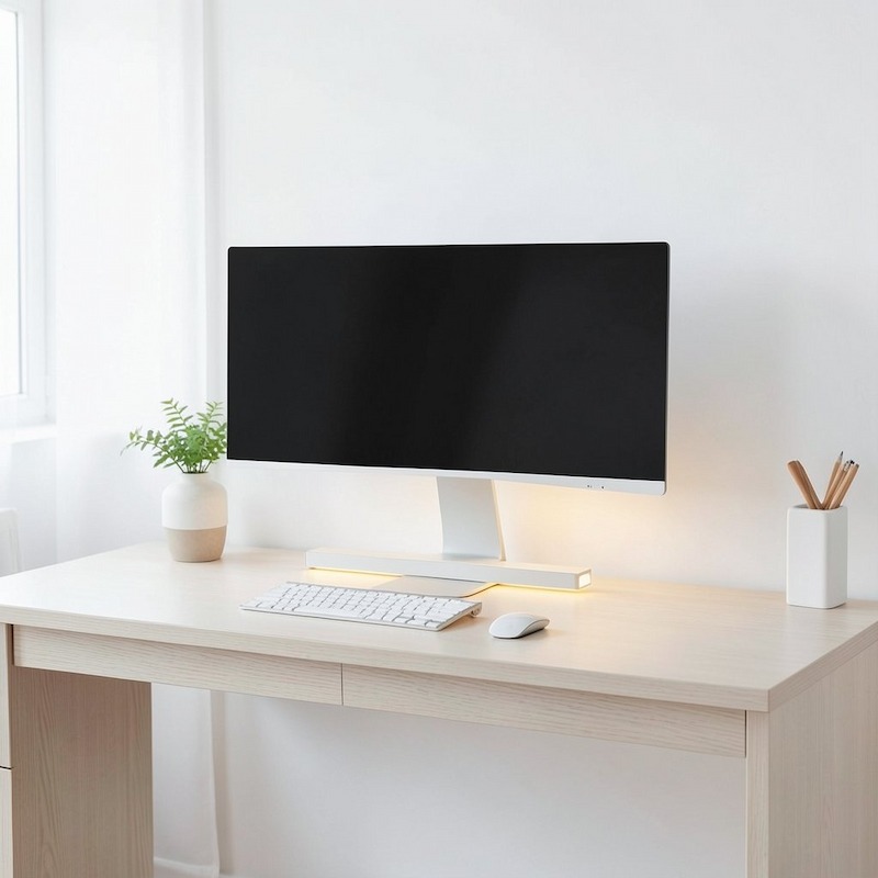 A simple home office desk with a wide monitor and a slim bar-shaped Smart Desk Light under the screen. Minimal, bright, modern style, white and light wood colors. Clean and calm atmosphere.(ワイドモニターと、画面下にスリムなバー型スマートデスクライトを備えたシンプルなデスク。ミニマルで明るくモダンなスタイル、白と淡い木目を基調とした配色。清潔で落ち着いた雰囲気。)