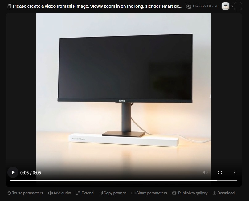 Please create a video from this image. Slowly zoom in on the long, slender smart desk lamp located below the monitor.(この画像から動画を作成してください。モニターの下にある細長い棒状のスマートデスクライトに向かって、ゆっくりとズームインしてください。動きは非常に滑らかでシンプルにしてください。)