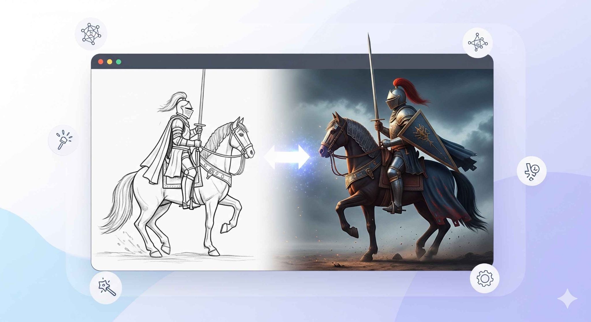 検証には、丸と棒線だけで描いたような「剣を構える人物」のラフスケッチを使用しましたが、AIが見事なコンセプトアートに仕上げてくれました。