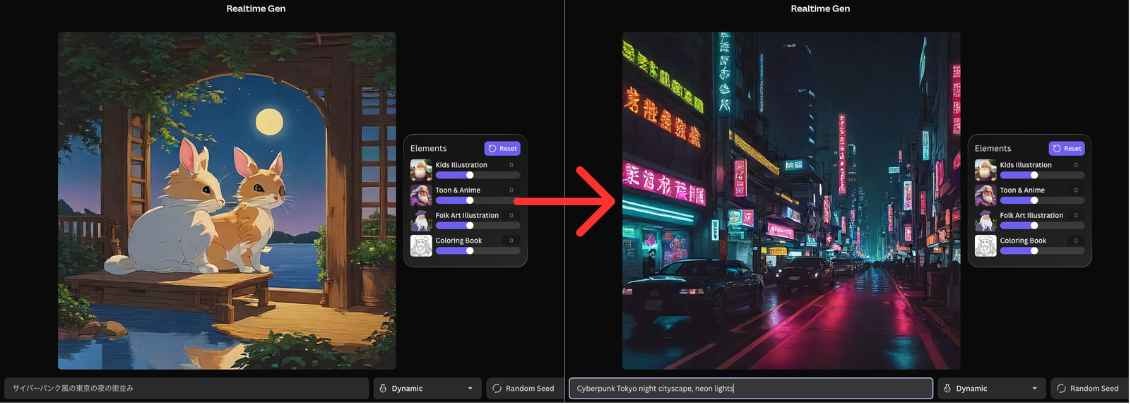 これは、プロンプトを入力したりパラメータを変更したりするたびに、画面上の画像が瞬時に(まさにリアルタイムで)変化していく機能です。