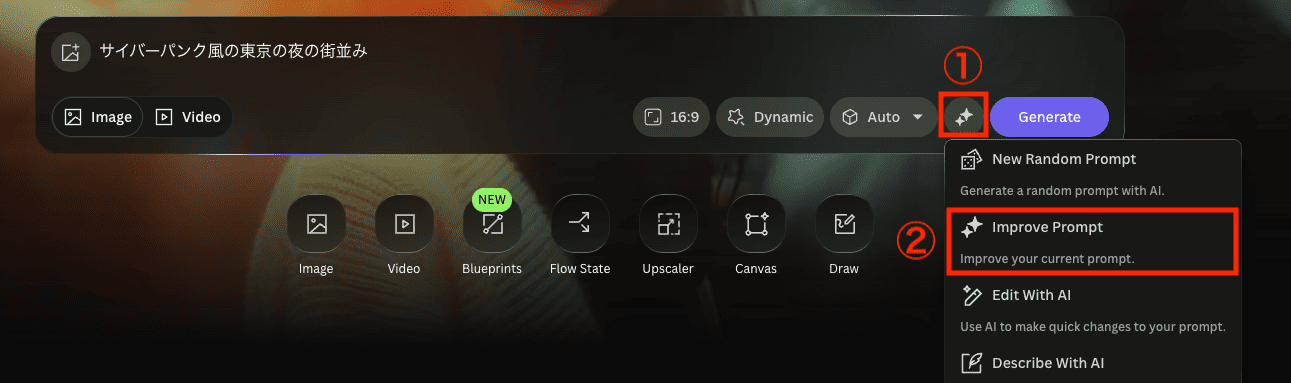【手順】 1. プロンプト入力欄の横にあるアイコンを押し、Improve Promptを選択