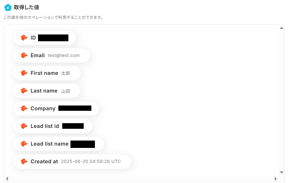 他にも取得した値を用いて設定できそうな項目があれば、必要に応じて設定してみてください。 Hunterに作成するリード情報の各項目が設定できたら、「テスト」ボタンを押してみましょう。取得した値に、Hunterに作成したリード情報が反映されていれば成功です!