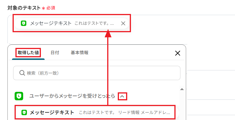 AIが情報を抽出する「対象のテキスト」を設定します。 前のステップでLINE公式アカウントでユーザーから受け取った「メッセージテキスト」を、取得した値から選んでください。