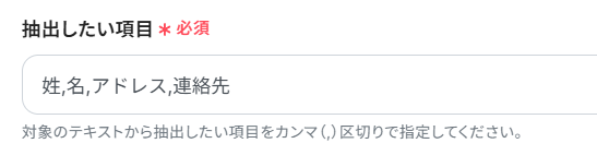 次に、対象のテキストから抽出したい項目をカンマ区切りで手入力してください。ここでは以下のように入力しました。