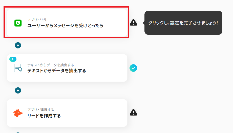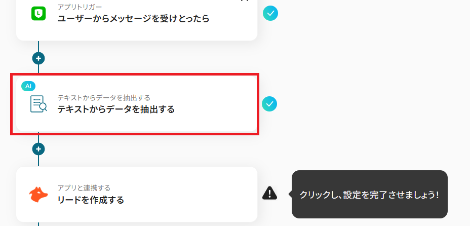 ステップ4:AI機能でテキストから情報を抽出する LINE公式アカウントで受け取ったメッセージから、Hunterにリードを登録する際に必要なデータを抽出する設定を行います。