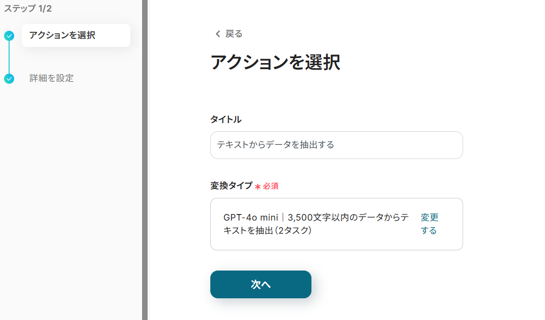 タイトルや変換タイプは任意で設定して「次へ」を押してください。 変換タイプは処理する対象のテキストの文字数に応じて、別のモデルを選ぶこともできます。ただし処理する文字数が大きくなればなるほど、消費するタスクの量が増えるため気をつけましょう。
