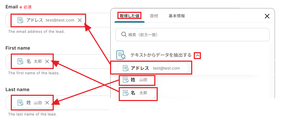 Hunterで新規作成するリードの情報について、各項目に取得した値を設定していきましょう。 例えば以下3つは、先ほどAIから抽出した情報を用いて設定できますね。