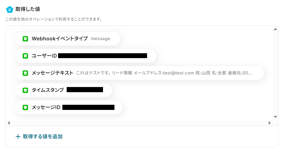 テストメッセージを送信できたら、Yoomの設定画面に戻って「テスト」ボタンを押してみてください。 「取得した値」として、以下のようにLINE公式アカウントへ送信したメッセージの内容が反映されていれば成功です!