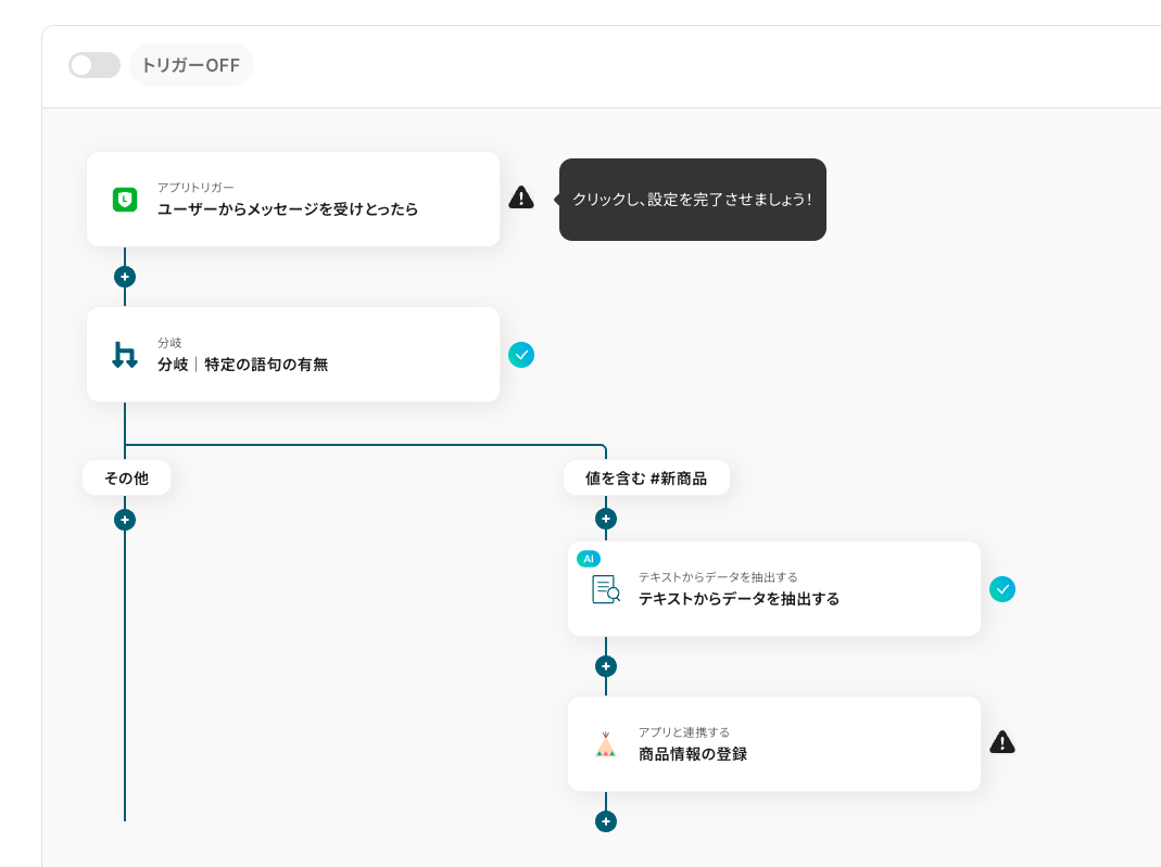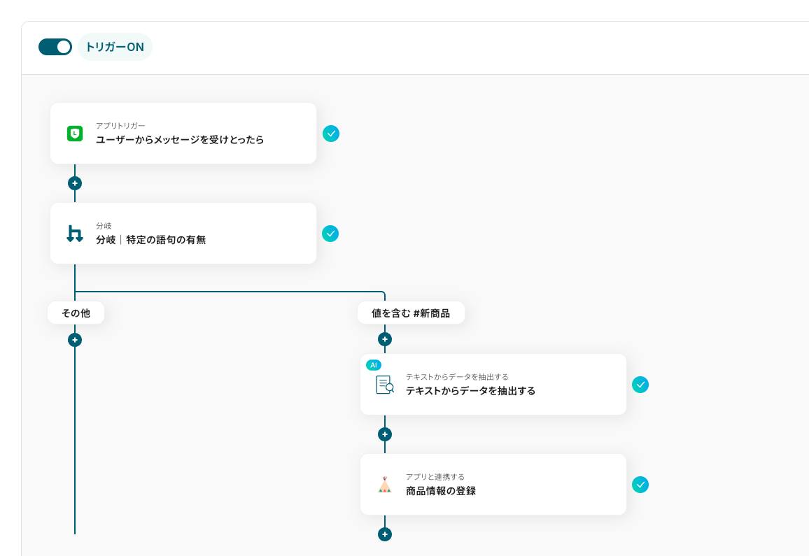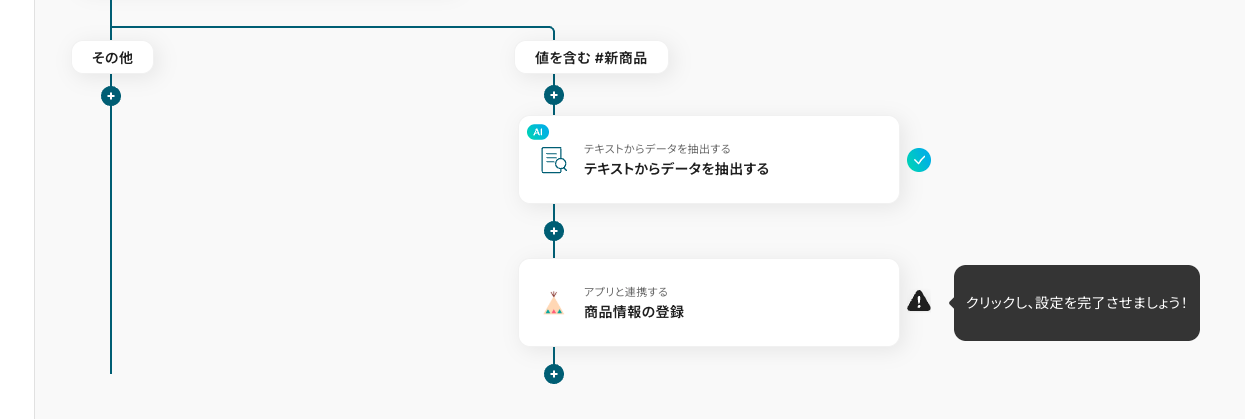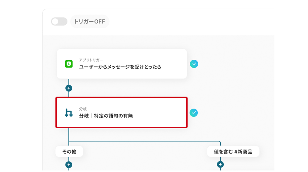 今回はメッセージテキストの中から、「#新商品」という語句を含むか・含まないかを分岐の条件に設定しています。語句は任意の内容に変更できます。