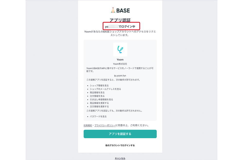 アプリ認証のすぐ下に、ログイン中のアカウント名が表示されます。連携先に間違いがなかったら、「アプリを認証する」ボタンをクリックすると、マイアプリ連携完了です。違うアカウントを紐づける場合は、「他のアカウントでログイン」するから、アカウント切り替えを行なってください。
