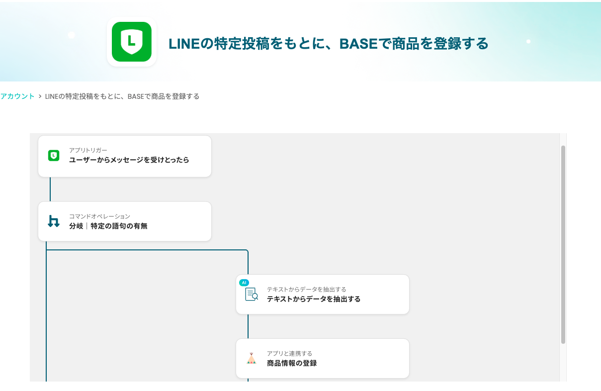 「LINEの特定投稿をもとに、BASEで商品を登録する」フローは、LINE上でのユーザーの特定投稿をトリガーにして、BASEに自動的に商品情報を登録する業務ワークフローです。