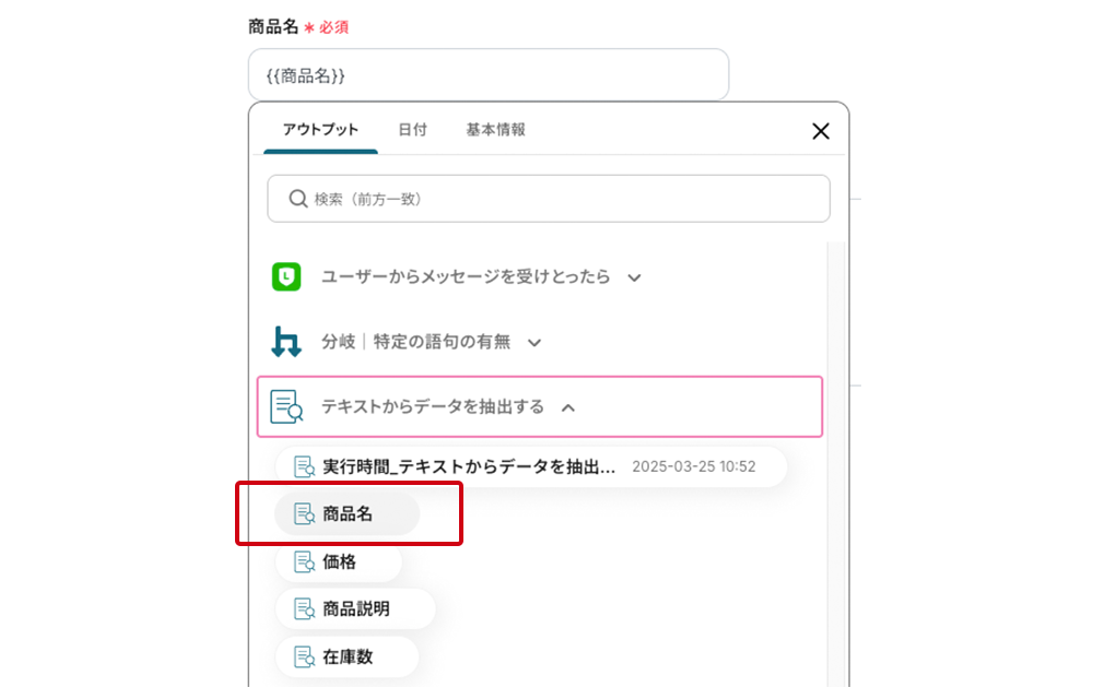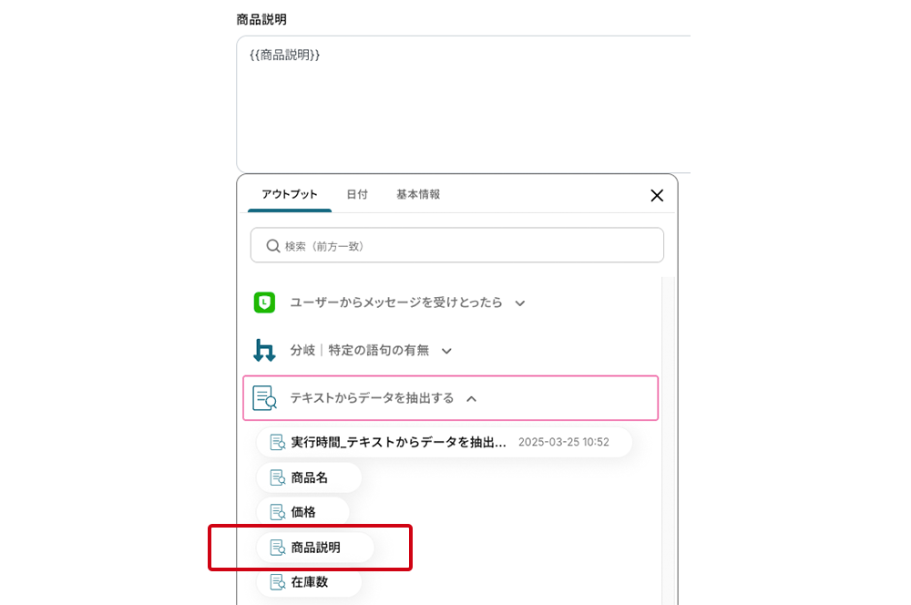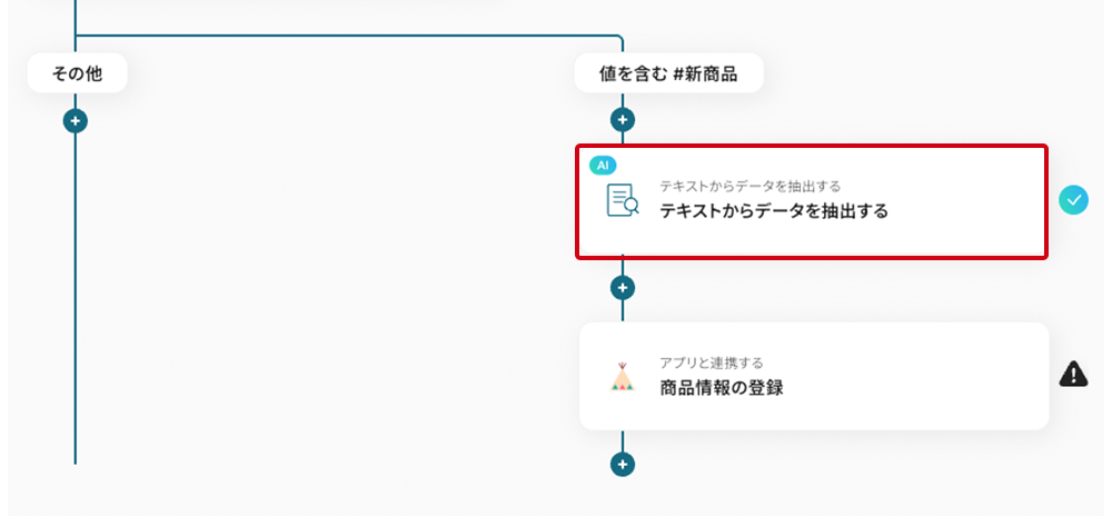 テンプレートの3つ目の工程をクリックします。この工程では、LINE公式アカウントのメッセージから商品名や価格などの情報をAIが判断して抽出する設定を行います。事前設定済みのため、設定済みの証(水色のアイコン)が点灯していますが、中身をご紹介するため開いてください。