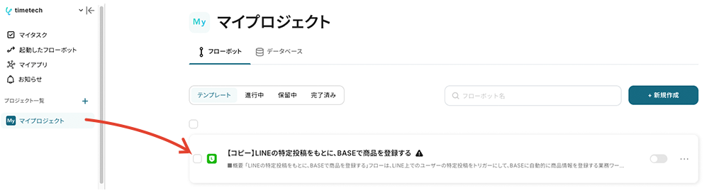 コピーしたテンプレートは、マイプロジェクトに追加されます。マイプロジェクトは左のメニューバーからアクセス可能です。