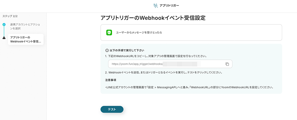 LINE公式アカウントのWebhook設定が完了したら、Yoomの設定画面に戻りテストに進みます。