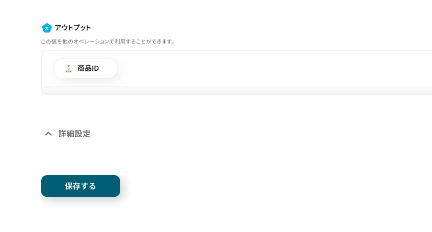 入力が終わったら、テストボタンをクリックします。成功すると、BASEに商品が追加され、商品IDがアウトプットで取得できます。