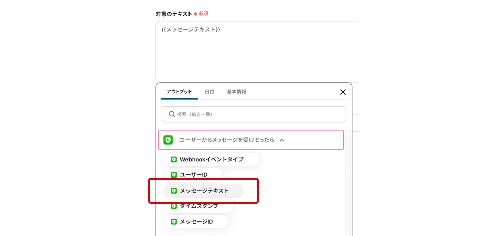 テストに成功すると、LINE公式アカウントで受け取ったのユーザーからのメッセージ情報から項目と値が取得できます。この項目と値をYoomではアウトプットと定義しています。