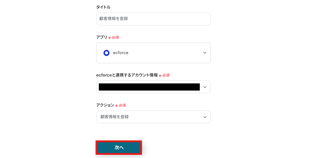 ecforceと連携するアカウント情報はプルダウンから選択します。 アクションには「顧客情報を登録」を選びましょう。 入力が終わったら、「次へ」を押して進めてください。