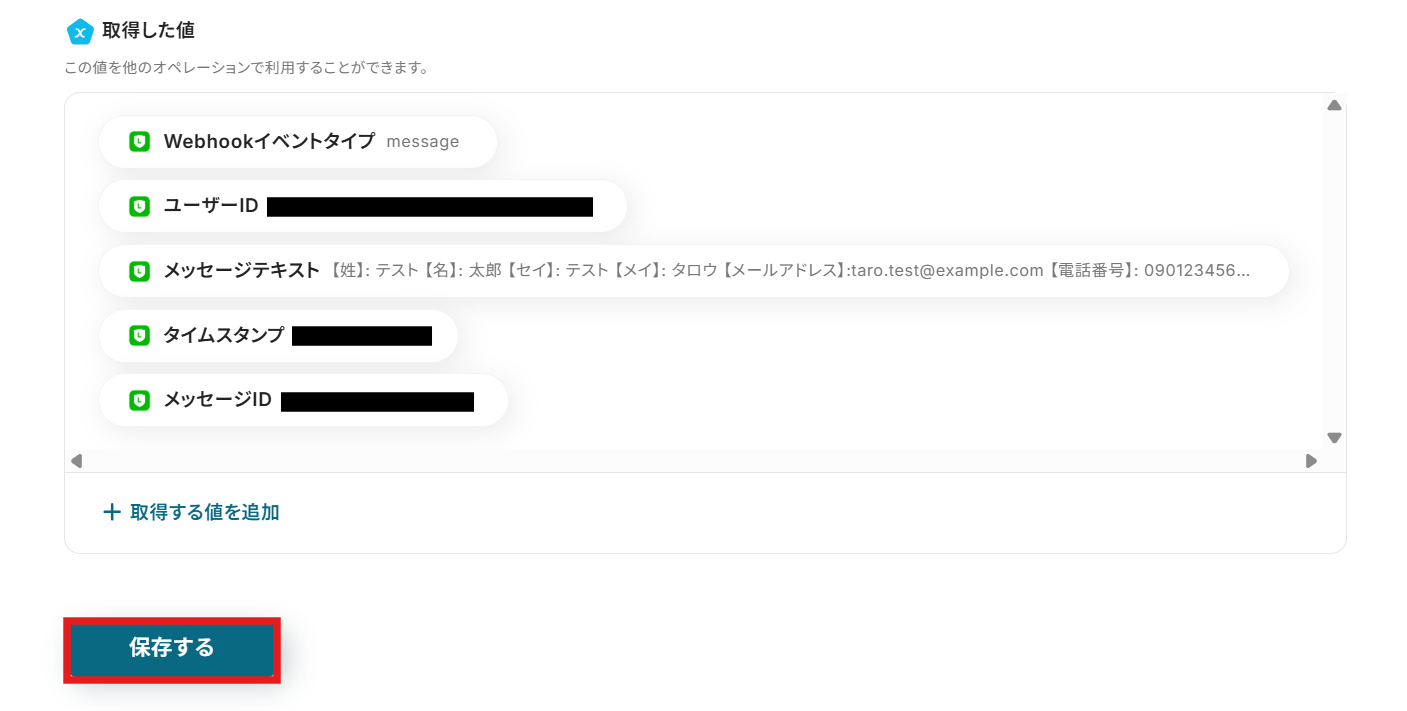 テストが成功すると「テスト成功」と表示され、LINE公式アカウントから取得した値 を引用できるようになります。 テストが成功したら、「保存する」をクリックするのを忘れないようにしましょう!