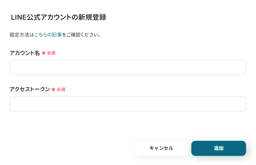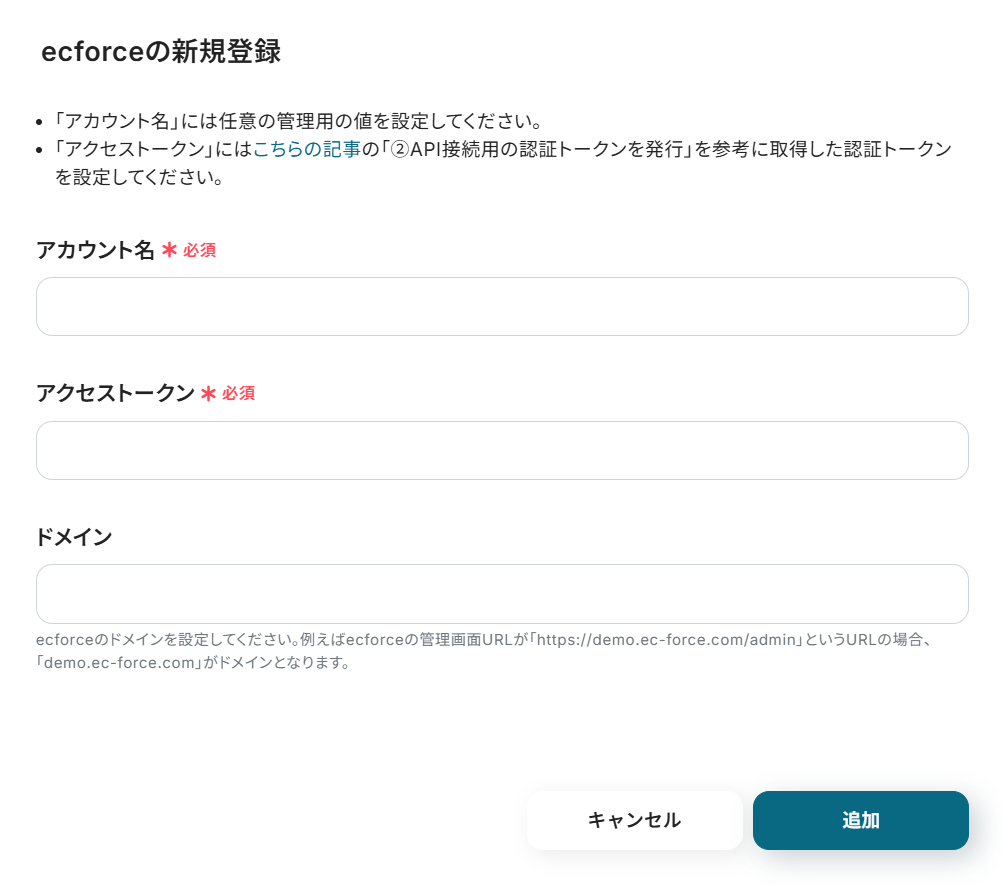 1. 以下のような画面が表示されます。アカウント名 :任意のものでOKです。管理しやすい名前にしておくと便利です。アクセストークン :こちらのヘルプページ を参考に設定してみてくださいね。ドメイン :必須ではありませんが、必要な場合は入力欄の下にある注釈を確認してから入力しましょう。