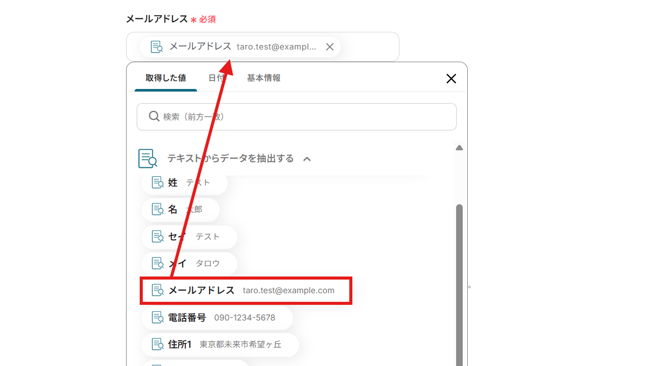 入力欄をクリックすると、テキストから抽出した内容を引用できます。 なお、手入力をしてしまうと、同じデータが重複してecforceに登録されてしまうため、あらかじめ取得した値を引用するようにしましょう。