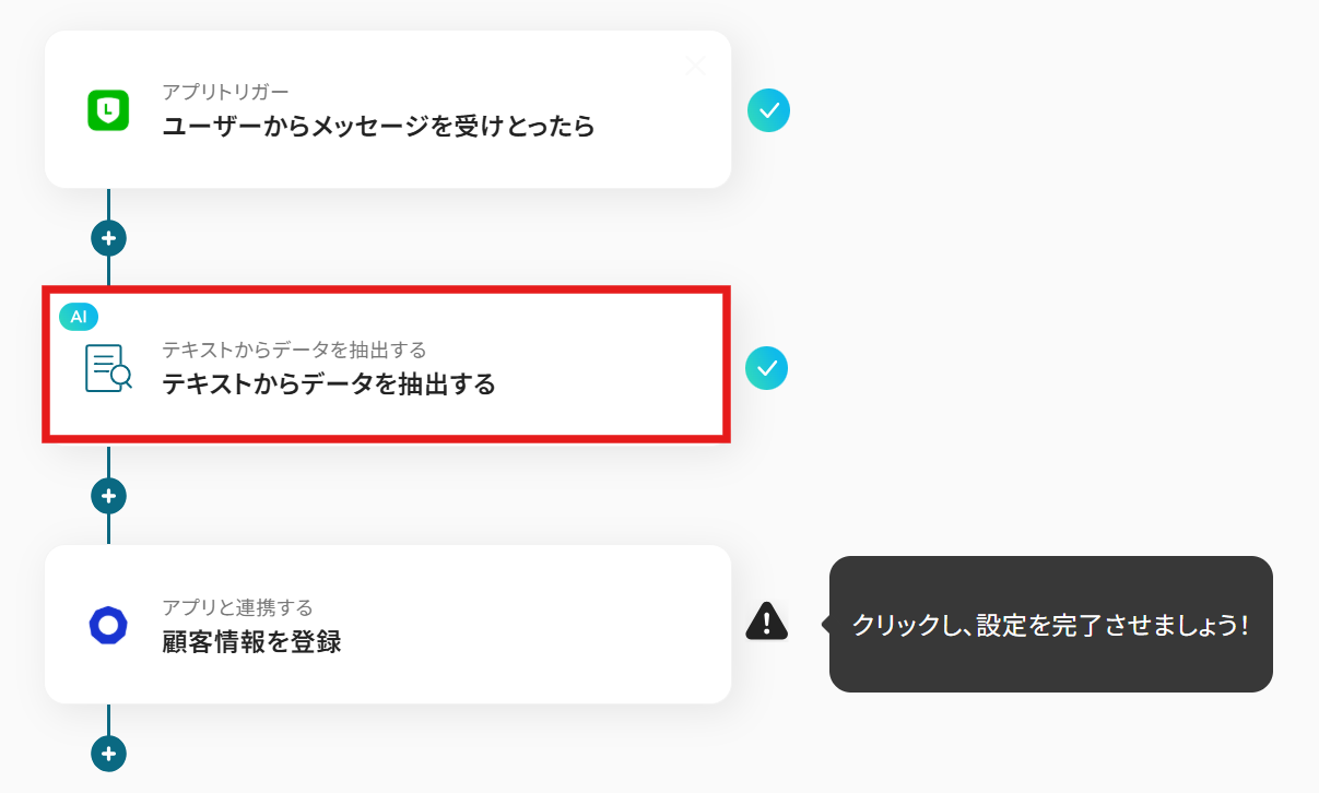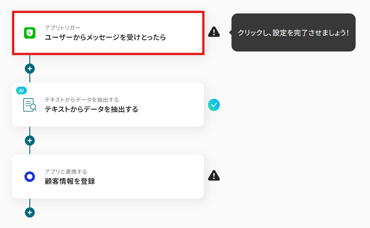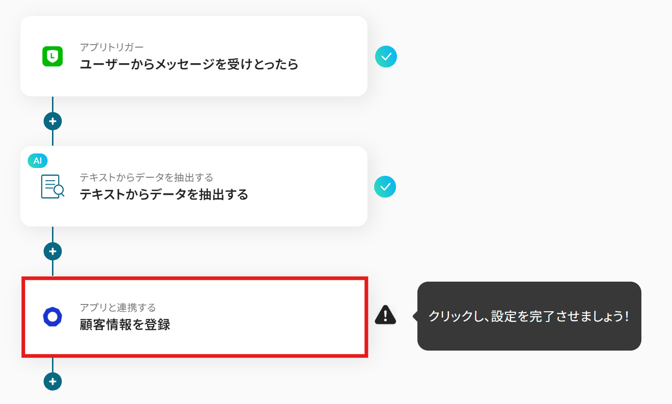 はじめに、LINEおよびecforceをYoomと連携します。 次に、トリガーでLINEを選択し、「ユーザーからメッセージを受けとったら」というアクションを設定します。 次に、オペレーションでAI機能を選択し、「テキストからデータを抽出する」アクションを設定し、LINEで受信したメッセージ内容から必要な情報を抽出します。 最後に、オペレーションでecforceを選択し、「顧客情報を登録」アクションを設定し、抽出したデータを基に顧客情報を登録します。 ※「トリガー」:フロー起動のきっかけとなるアクション、「オペレーション」:トリガー起動後、フロー内で処理を行うアクション