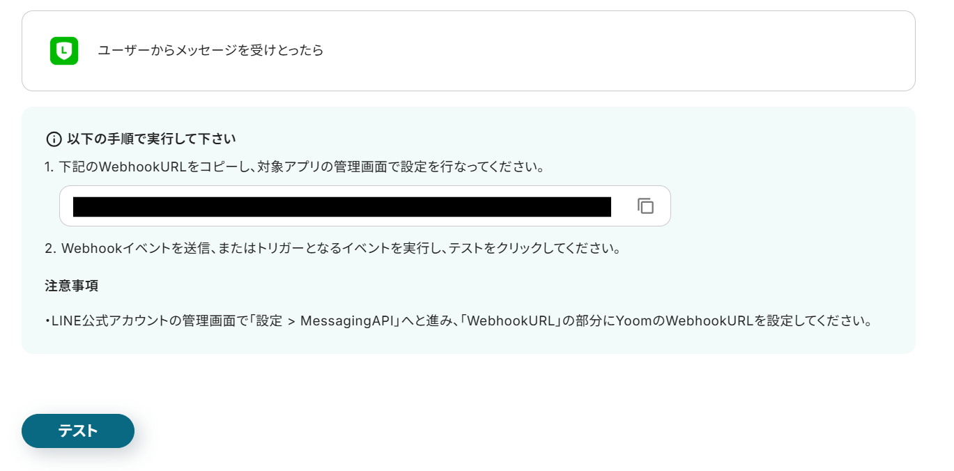 設定が終わったら、LINE公式アカウントの画面で試しにメッセージを投稿してみましょう。 今回は、テストとして以下のようなメッセージを投稿しています。 終わったらYoomに戻り、「テスト」をクリックしましょう。