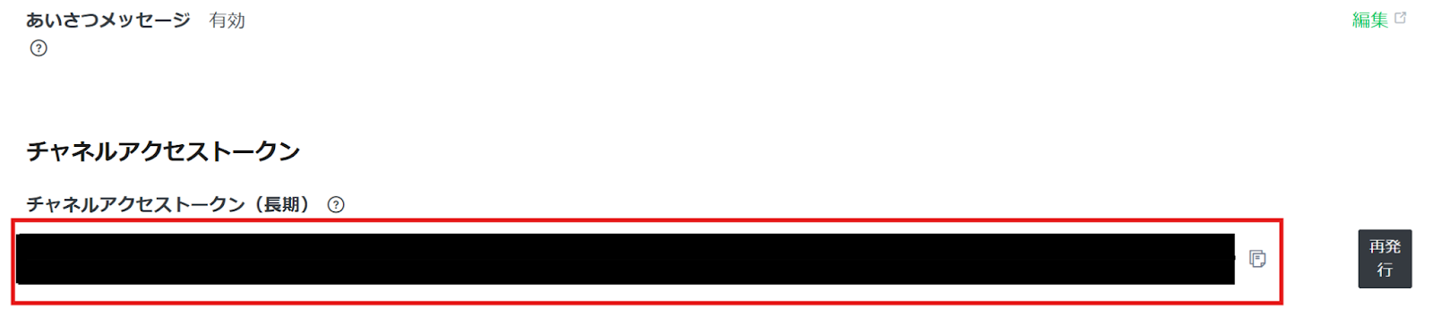 3. 下にスクロールしていくと、チャネルアクセストークンが表示されます。 コピーして、アクセストークン の箇所に貼り付けましょう。 これで、LINE公式アカウントのマイアプリ登録は完了です。 詳しい設定方法については以下のリンク先を参照してください。