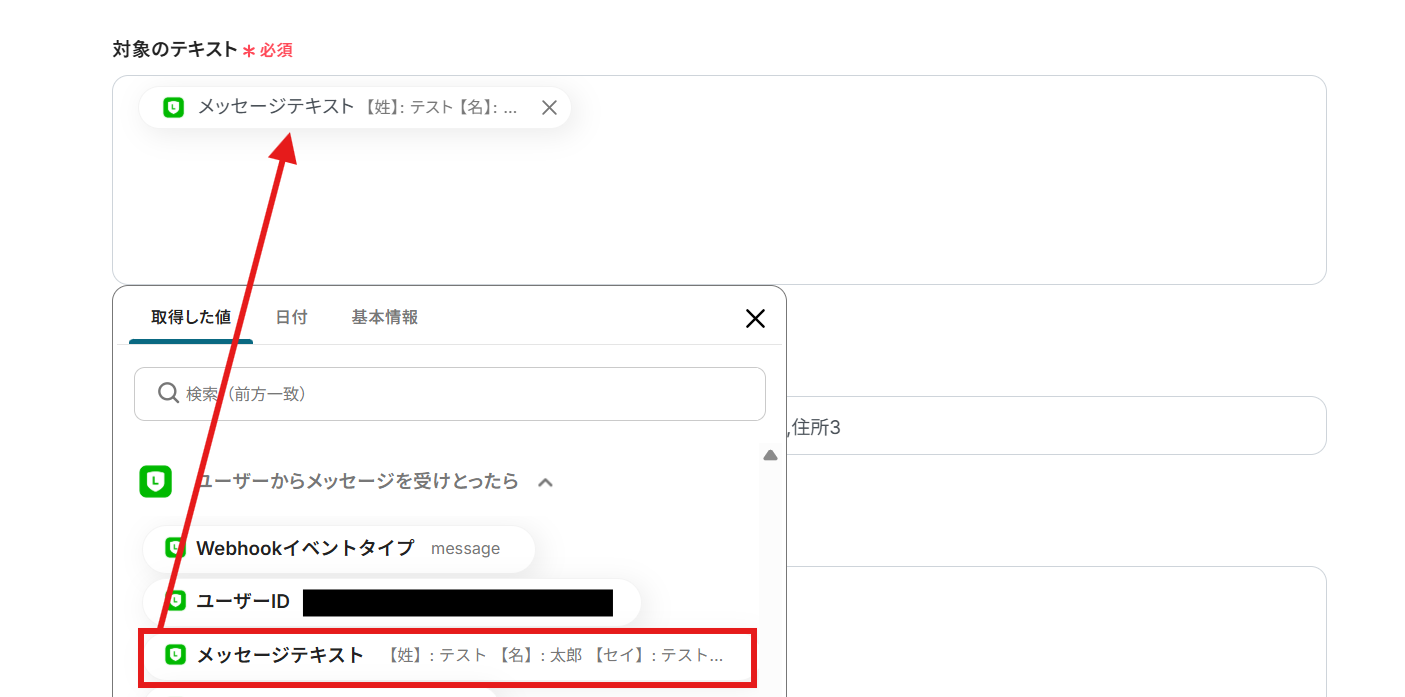 対象のテキスト: デフォルトではLINE公式アカウントで投稿したメッセージから抽出するように設定されています。編集欄をクリックすると、LINE公式アカウントから取得した値を引用できます。今回は変更していません。