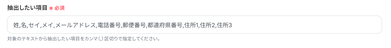 抽出したい項目: 初期設定では、氏名やメールアドレスなどの基本的な情報が抽出されるようになっています。必要に応じて、カンマ区切りで項目を追加することも可能です。