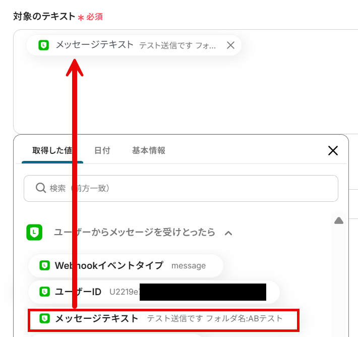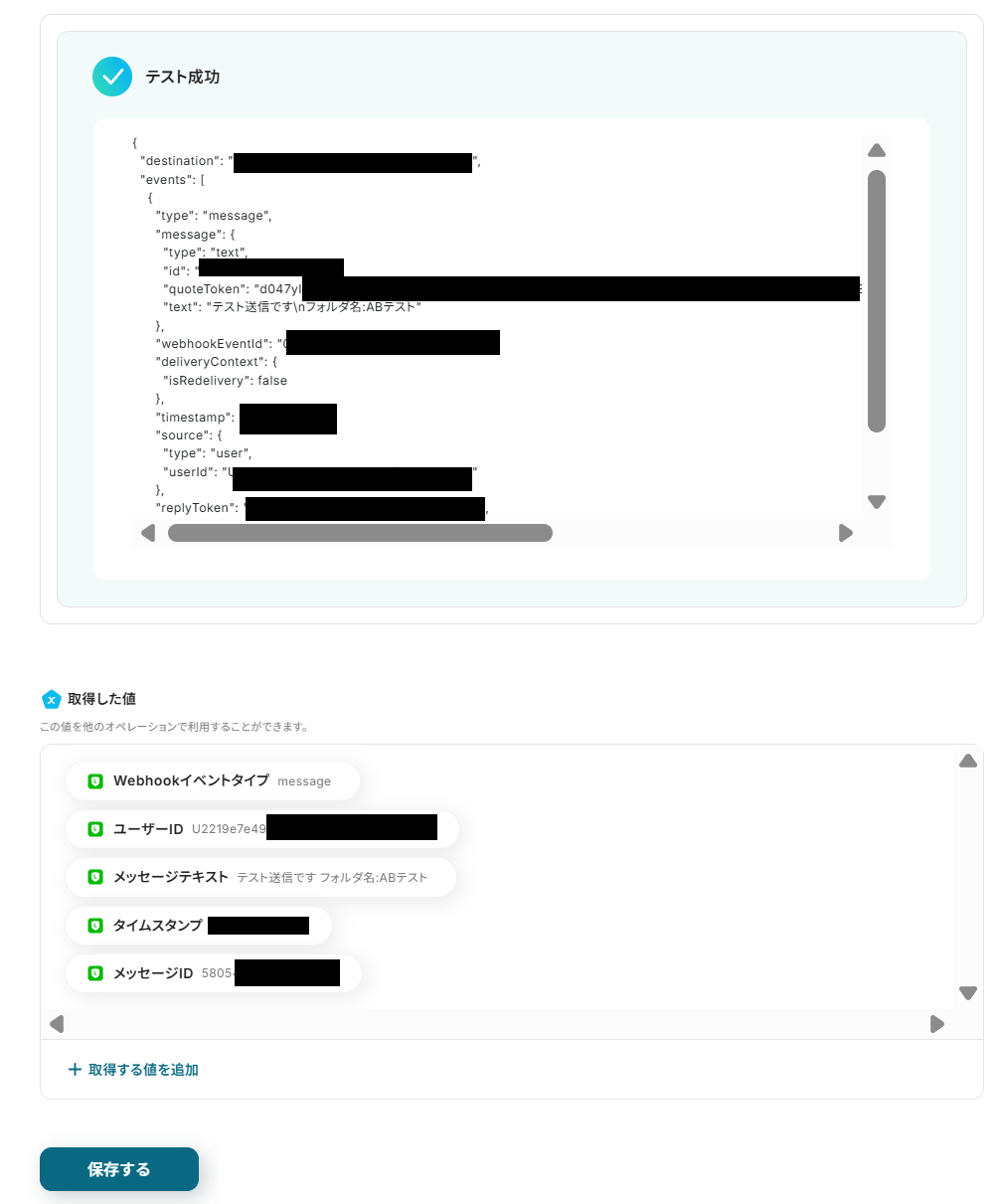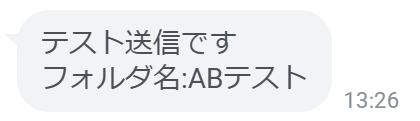 ここまで設定ができたら連携テストを行うため、LINE公式アカウントに以下のようなテストメッセージを送信します。