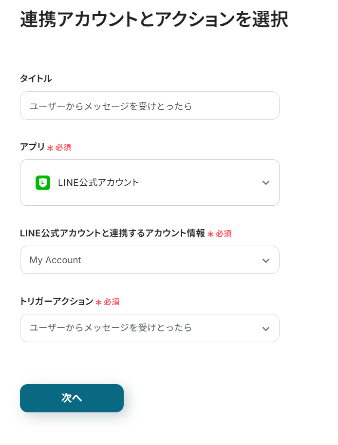 - トリガーアクション:LINE公式アカウントでユーザーからメッセージを受け取ったら起動します。