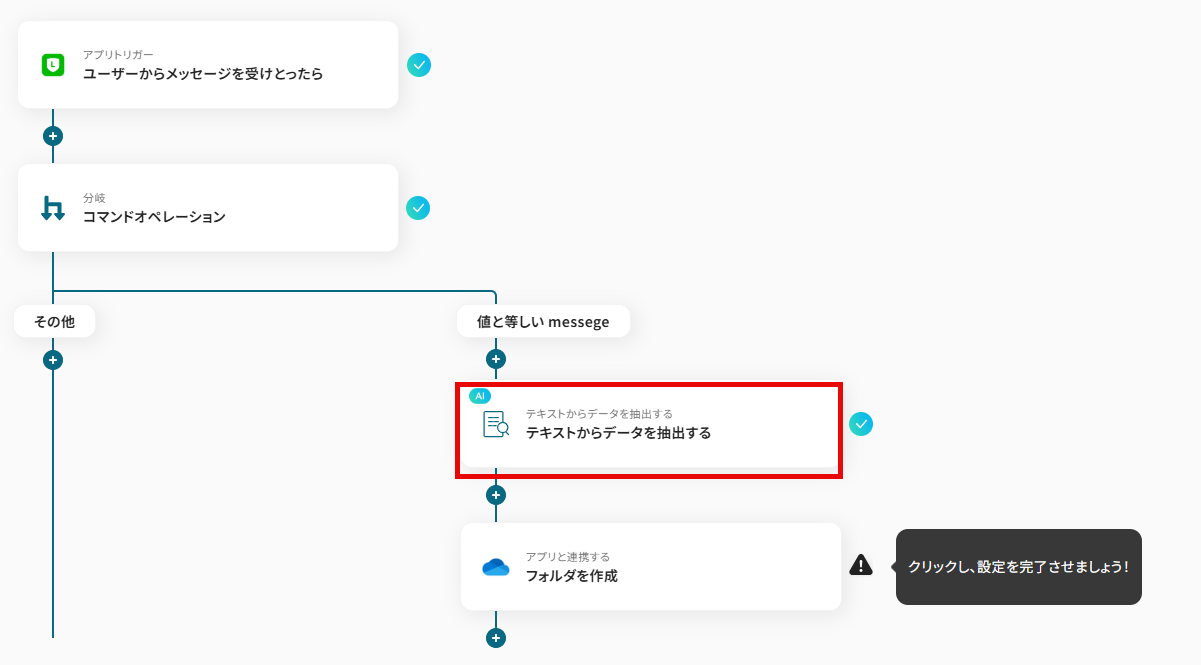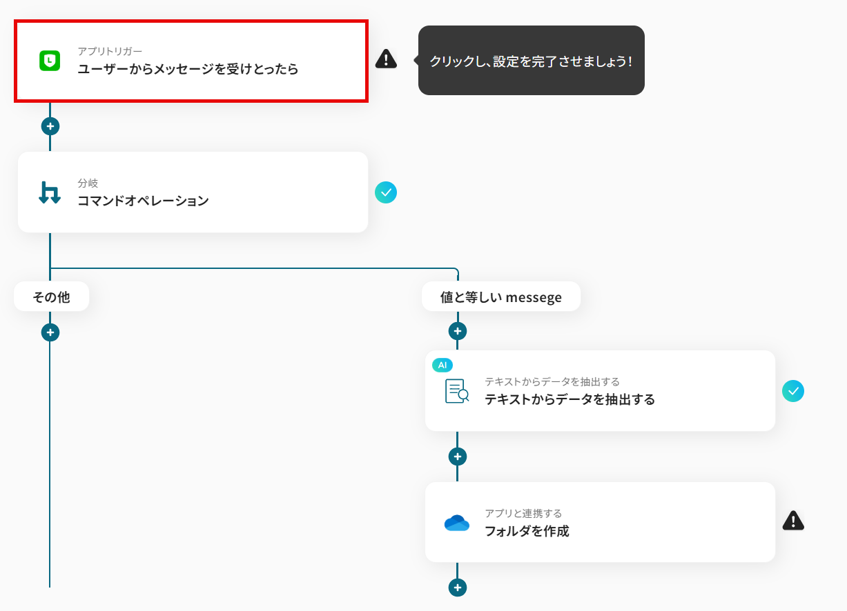 LINE公式アカウントで特定のキーワードを含むメッセージを受信した際に、そのメッセージ内容から顧客名や案件名といった情報を自動で抽出し、OneDriveに専用のフォルダを自動作成します。
