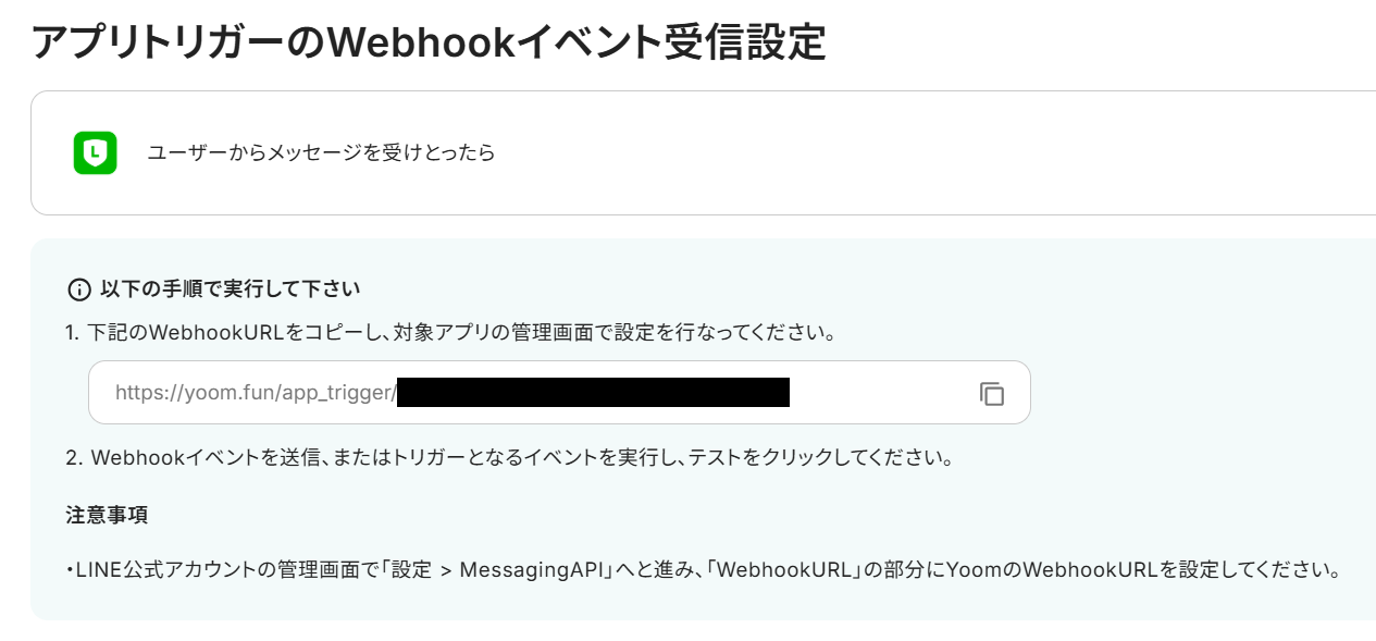 Webhookイベント受信設定を行います。この設定を行うことでリアルタイムでメッセージを受け取ることが可能です。