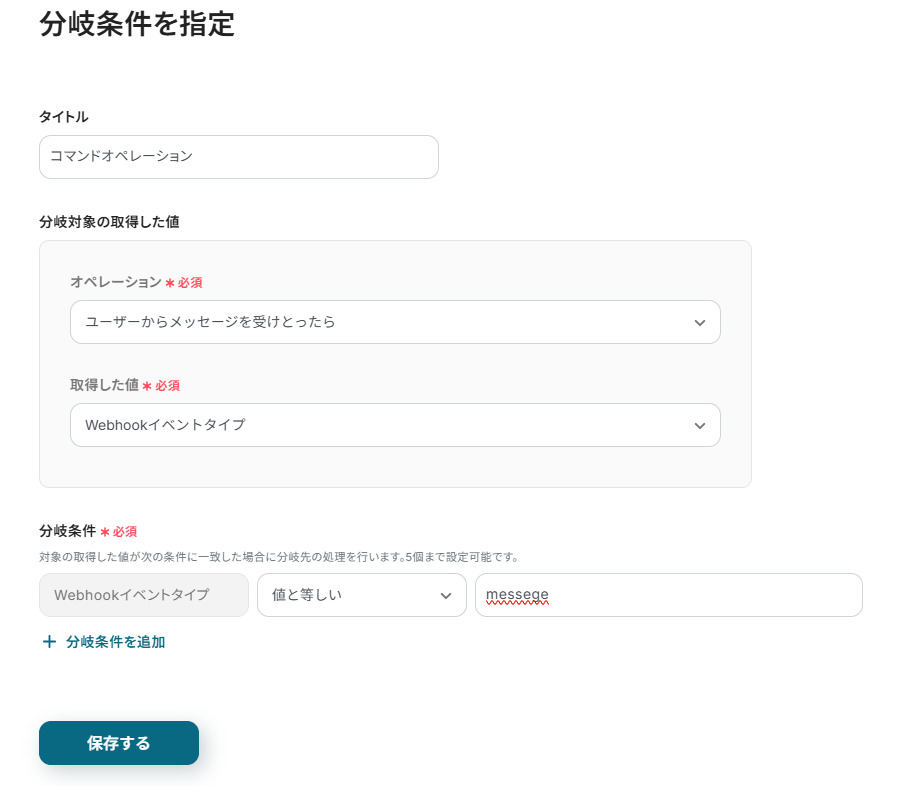 以下のように、今回の分岐条件は「Webhookイベントタイプ」の値が「message」と等しい場合にアクションが進むように設定されています。