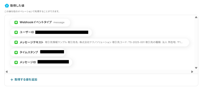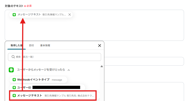 対象のテキストには以下のように取得した値から「メッセージテキスト」を選択しましょう。