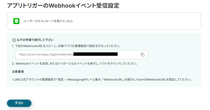 実際にメッセージを送信後、「テスト」をクリックしましょう。