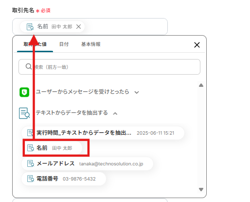 取引先名、電話番号、担当者メールアドレスには以下のようにAIで抽出した値をクリックし、入力しましょう。