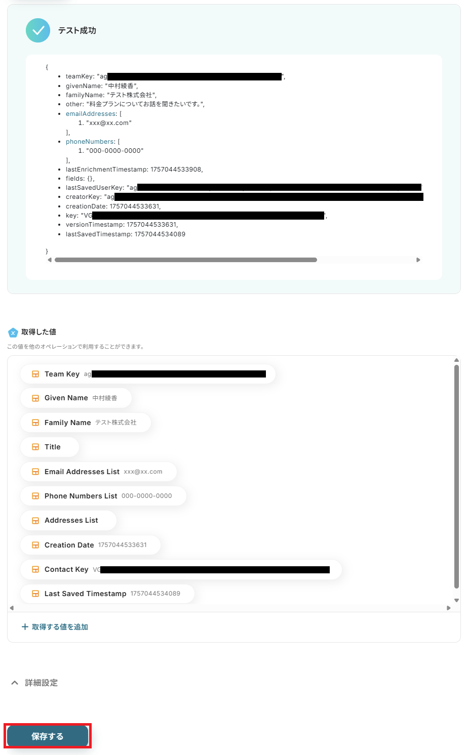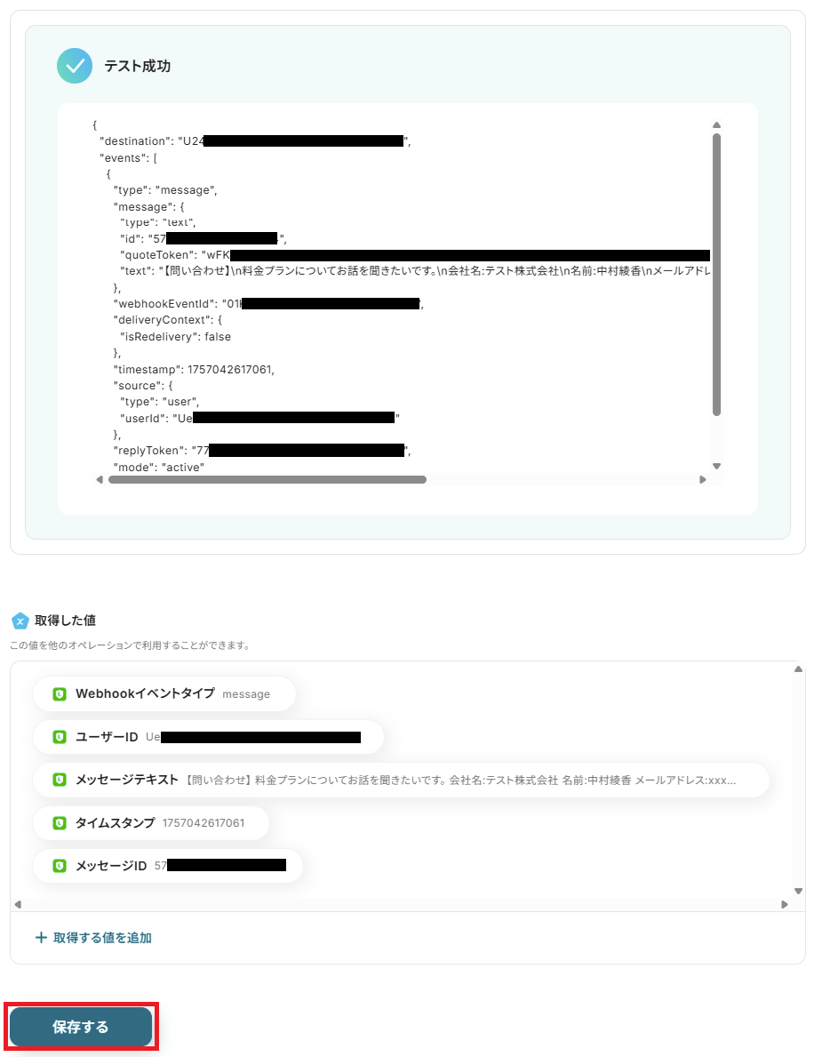 テストが成功すると、取得した値が表示され、LINE公式アカウントのデータが確認できます。「保存する」をクリックして完了です!