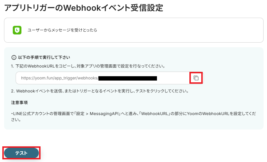 Yoomの画面に戻り、「テスト」をクリックします。