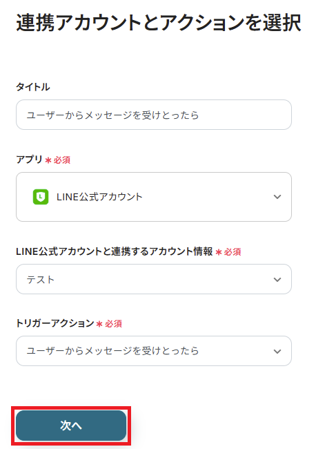 トリガーアクションが「ユーザーからメッセージを受けとったら」になっていることを確認して「次へ」をクリックします。