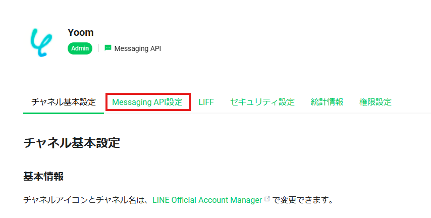 作成したチャネルを選択からMessaging API設定へ進みます。