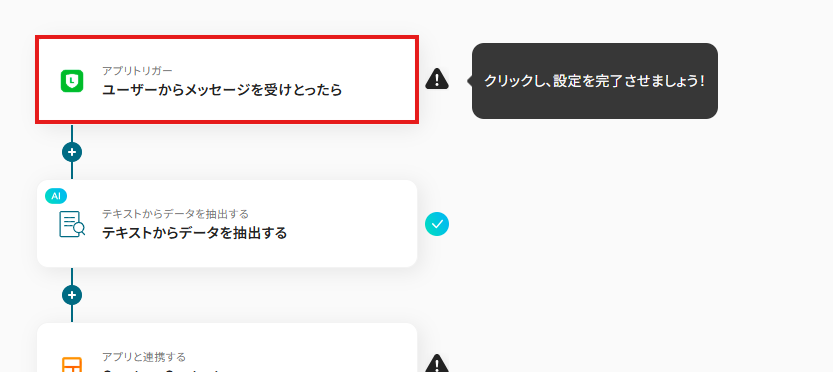 まず始めに、LINE公式アカウントにユーザーからメッセージを受けとったら時のトリガーを設定していきます。