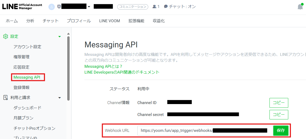 LINE公式アカウントにWebhook URLを設定しておきます。