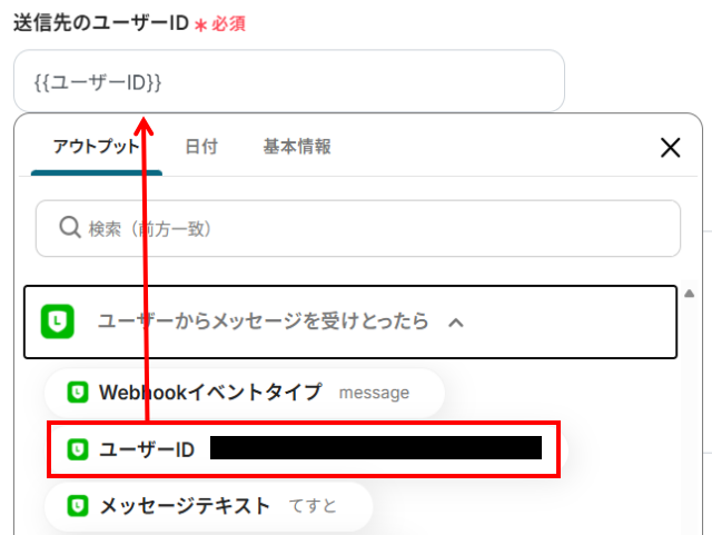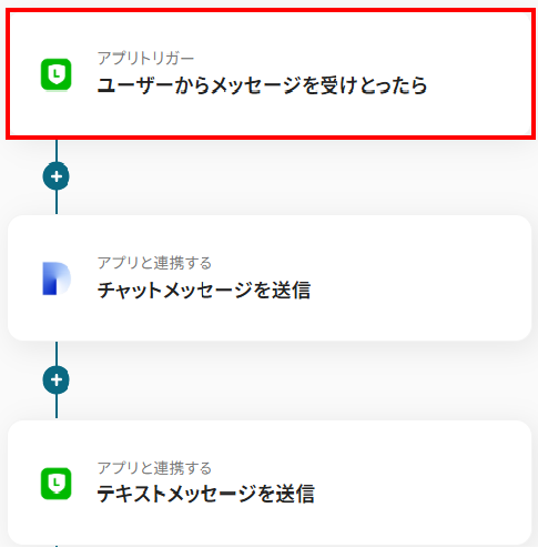 1.赤枠の「ユーザーからメッセージを受けとったら」をクリック
