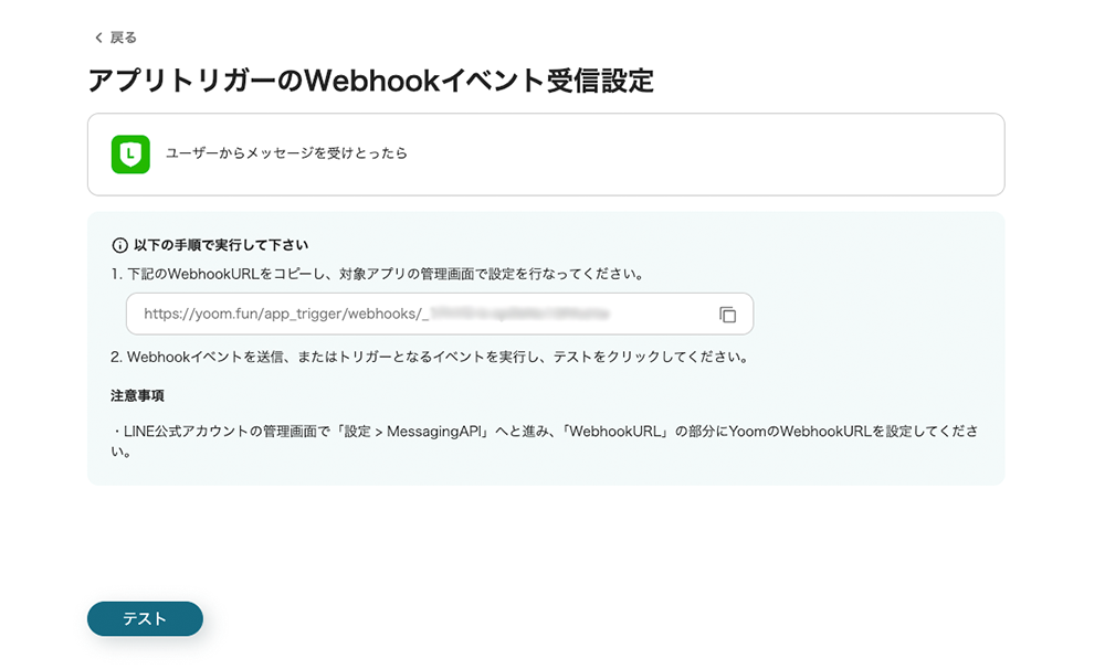 設定後、Yoomの画面に戻りテストに進みます。実際にテストとして、メッセージを送受信してみましょう。