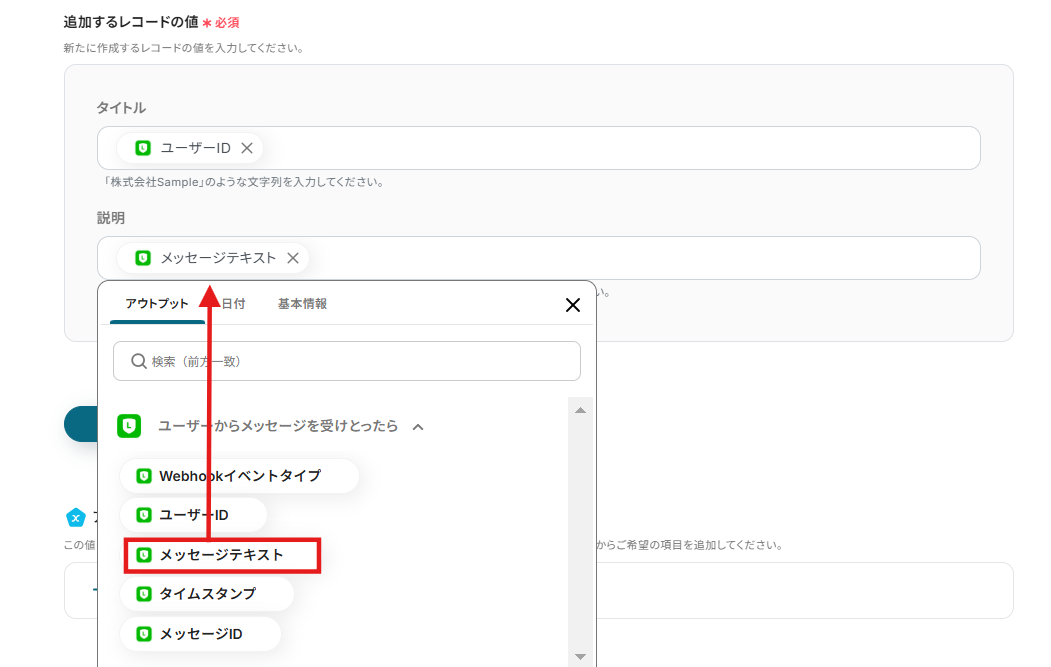 このようにすると先ほどLINEのトリガーで取得したデータをそのままkintoneの対象フィールドに引用することができます。
