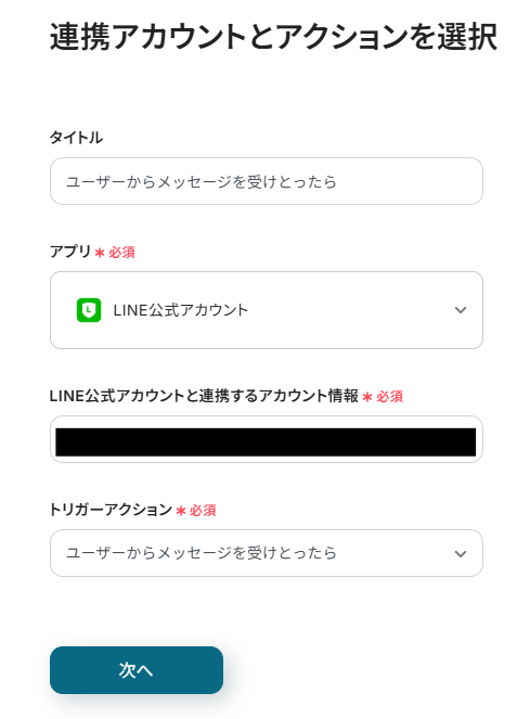 - 「アクション」→ユーザーからメッセージを受けとったら