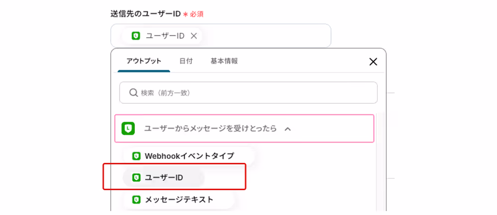 - 事前設定で、1つ目の工程で取得したユーザーIDの引用コードが埋め込まれています。これも、編集欄をクリックして表示されるプルダウンメニューから確認できます。